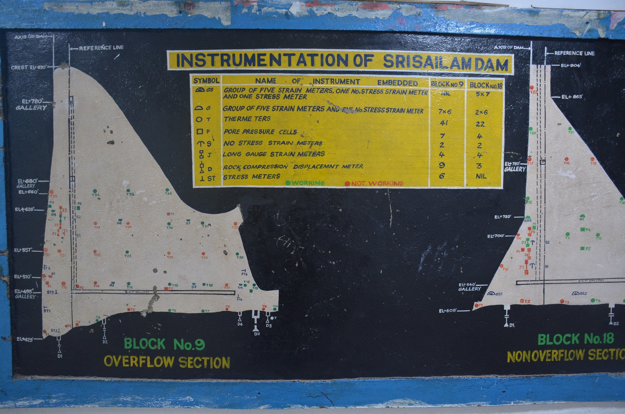 dam is divided into 22 blocks total. The dam is fitted with various instruments like thermometers, pressure cells, rock displacement meters etc. These instruments provide the condition of the dam and are useful for monitoring safety. For example, thermometers provide the temperature of the concrete. Temperature fluctuations result in contraction or expansion of concrete and affect volume and cause cracks. You can see in the above image obtained in Aug, 2019, some of the instruments are not working (labelled in red). Historic 2009 Krishna River Floods Srisailam dam witnessed unprecedented floods in